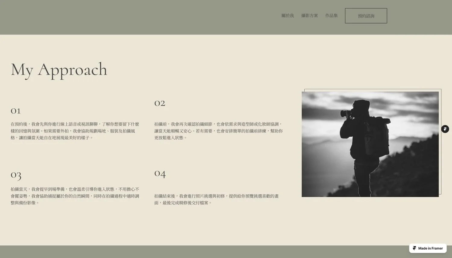 設計上,我特別融入了些微的動態效果,讓圖片與內容在捲動間流暢地展現,賦予網站生命力與互動感,同時避免喧賓奪主,確保訪客的目光能聚焦於攝影作品本身。頁面佈局則著重於留白空間的運用,讓每一幅攝影作品都能「呼吸」,引導觀者細細品味光影的層次與情感的流動。
